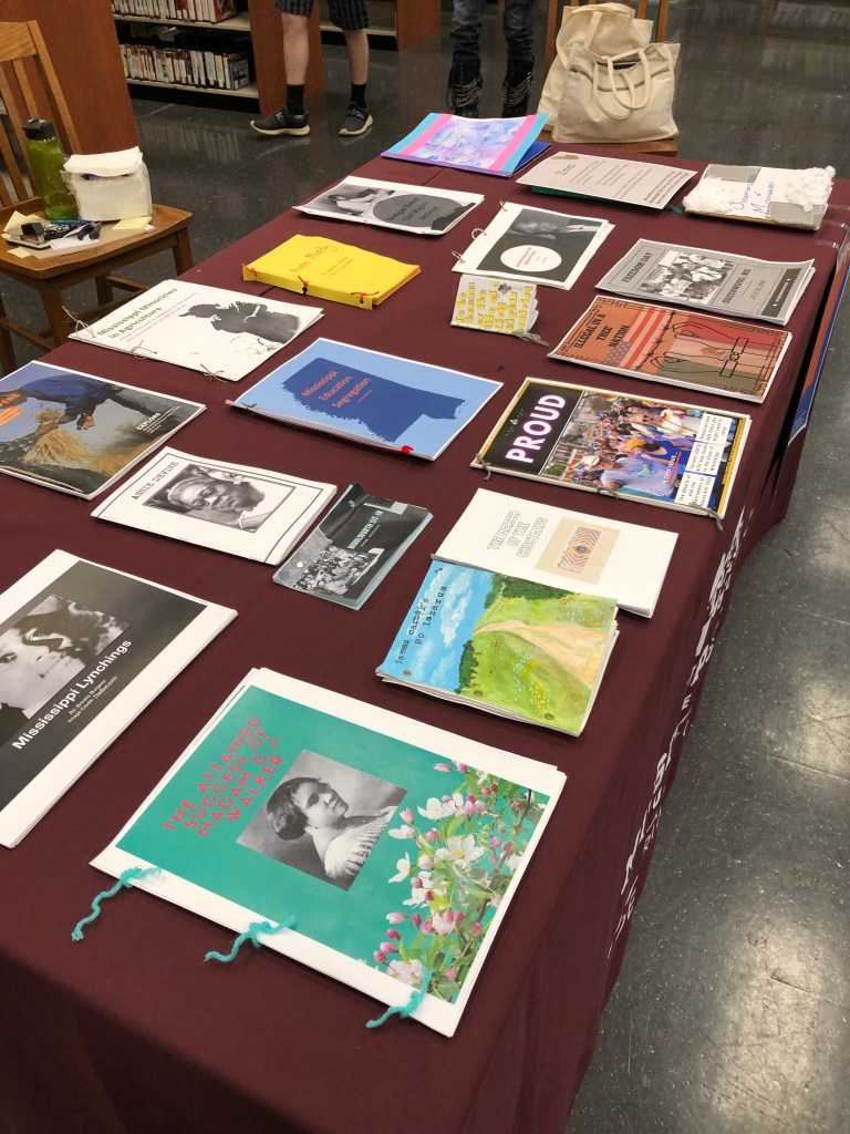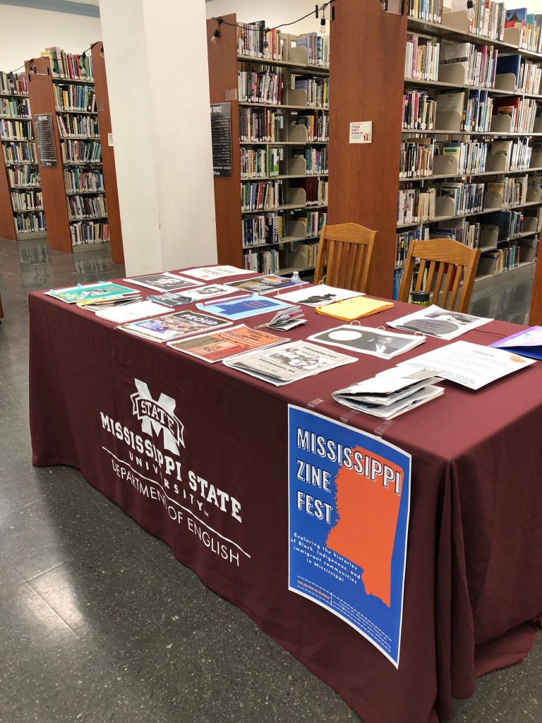 The Mississippi Zine Fest highlights zines on Mississippi related topics or produced by zine creators located in Mississippi. The first Mississippi Zine Fest was held by Dr. Dhanashree Thorat’s American Literature class in December 2019. The annual showcase has scaled up since then. In 2022, the Starkville Public Library hosted the zine fest and provided a public venue for community members to access and read student projects. And in May 2023, the Starkville Area Arts Council held an opening reception and showcase for the Mississippi Zine Fest in their downtown location. This last iteration of the Mississippi Zine Fest was also opened up for community members to submit their own zines. Other classes in African American Studies and Gender Studies have since joined the zine fest.